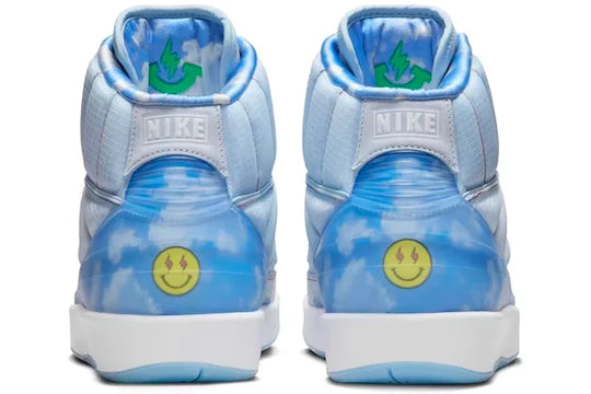 Compared to his AJ 1 collaboration, J Balvin's latest AJ 2 is much more "understated" but still a standout piece, featuring a soft blue shade with cloud graphics for a dreamy vibe.